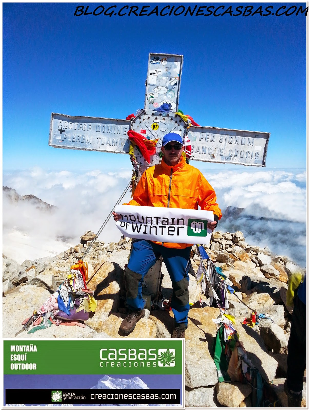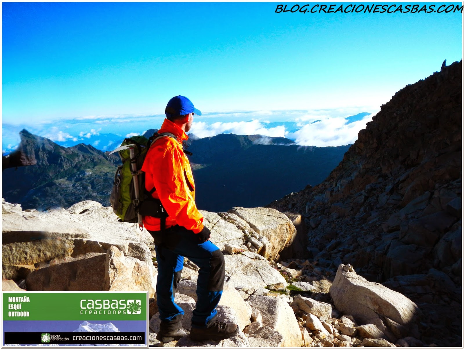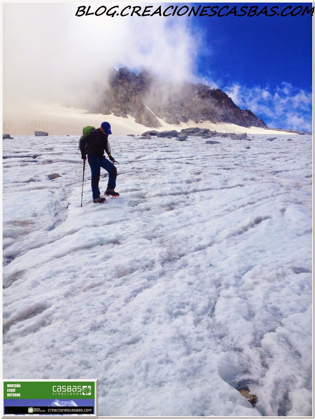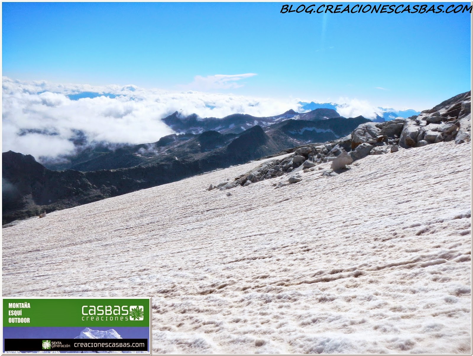 Atravesado este paso coronamos la cima del Aneto (3.404 m.), segunda mayor altura de la Península Ibérica, y tercera de España (después de Mulhacén con 3.483 m. y Teide 3.718 m.). Es el techo provincial de Huesca, situado en el valle de Benasque, y forma parte del macizo de Maladeta. En su cara norte, a partir de los 1810 metros, hemos atravesado el mayor glaciar de los Pirineos.
