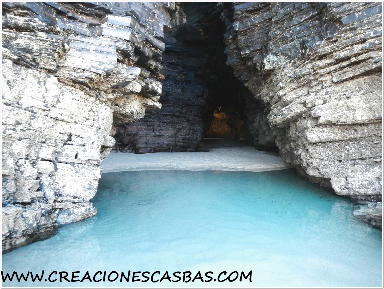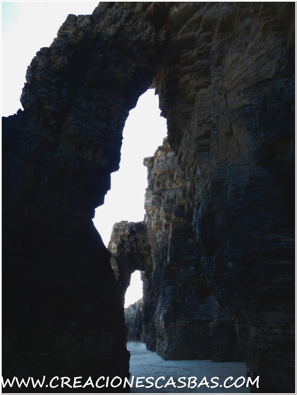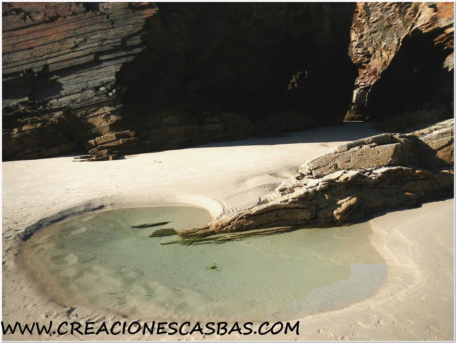 Seguimos por túneles uniendo unas cuevas con otras, alguna bóveda, vemos un gran pequeño lago, el primer y más famoso arco, y más y más arcos y cuevas… Todo rodeado de arena limpísima, mejillones y percebes.